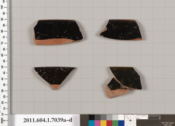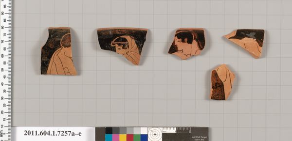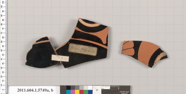 Curator: These terracotta fragments, remnants of a kylix or drinking cup from 530 BC, raise fascinating questions about the production and consumption of art in ancient Greece. Editor: Yes, what survives of the object’s material quality—the ochre clay and now-faded black slip—it all feels very grounded. What do you find particularly interesting about this piece? Curator: I am immediately drawn to the labor embedded within this object. Consider the process: digging the clay, refining it, shaping it on the potter's wheel, and then the skilled application of the black-figure decoration, all the handcrafting done to eventually result in trade, in economical use. Does examining its physicality shift our understanding? Editor: Absolutely! When you put it that way, the skill involved is really foregrounded. Before you spoke, it was easier to simply appreciate it as a visual example of early Grecian artwork. Curator: And what was its place in the cultural economy? Was this mass-produced, intended for wide distribution and consumption, or was it luxury made for just some people? Did its function dictate its materiality and design, or was something else at play? What survives represents only a piece, quite literally, of this long complex chain. What does the loss mean, ultimately? Editor: Thinking about those production and consumption questions alongside these abstract remnants creates this ghostly effect—a social snapshot that’s incomplete. Thank you for sharing that different perspective! Curator: And thank you for prompting it. Thinking about these works as part of production and economic history gives them a life and context that traditional art history often overlooks.