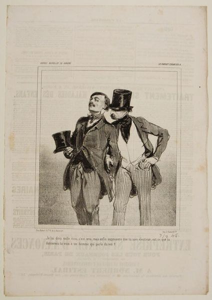 Curator: This is "Mrs. Beauminet is well? . . ." by Paul Gavarni. Editor: Oh, it's got this lovely, slightly uncomfortable feeling about it, like overhearing a very stilted conversation. Curator: Gavarni, a 19th-century French artist, was known for his satirical lithographs of Parisian life. He captured the nuances of social interactions. Editor: I see that. The rigid posture of the figure on the left is fascinating. He almost seems inflated, while the other one bows deeply, as though his social obligation is quite heavy. Curator: Indeed. The contrast is striking. Gavarni often used clothing and posture to critique the bourgeoisie. Perhaps there's a comment on social climbing? Editor: Maybe. It really invites a moment of reflection, doesn't it? It's always amazing how art can reveal our society in subtle ways.