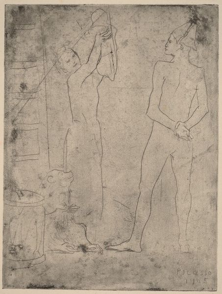 Curator: Stepping up to Massimo Campigli's 1932 etching, "L'incontro II", or "The Meeting II," what captures your eye first? Editor: It’s like a ghostly gathering. Faint, melancholic... the way the figures fade into the background gives it an eerie feel, almost like a memory. Curator: Absolutely. Campigli had a knack for capturing that wistful feeling, didn't he? "L'incontro II," for example, skillfully arranges these figures. What seems significant here is how the interplay between the geometric and the organic establishes a powerful compositional framework. Don't you think so? Editor: I suppose. The sharp angles and defined lines of their clothing offer some structure against the haziness, sure. They are rigid like architectural constructs. Curator: Campigli was moving towards this almost archaeological figuration by this point in his career. Aren’t the subjects more like excavated artifacts here? Editor: Well, in terms of emotion... I think the figures in "The Meeting II," however geometric, suggest connection and interaction to me—though veiled. There’s something about the raised arms, the implied touch. It pulls at me… reminds me of reunions, bittersweet farewells. Curator: Precisely. He uses very economic gestures but gives such an interesting effect to our eyes! Campigli encourages viewers to decode visual elements like semiotic puzzles... inviting contemplation and multiple interpretations. Editor: Oh, totally! I’d agree, his approach challenges us, or coaxes us even, to explore and find resonance through visual stories. But sometimes I just love not knowing—letting art tickle my soul without the mental acrobatics! Curator: And that, ultimately, is what makes "The Meeting II" such a success. Whether you are into formal language, semiotics, archeology or just like seeing cool ghosts! Editor: It stays with you somehow... not for what it shows but for how it makes you feel. A beautiful enigma, definitely.