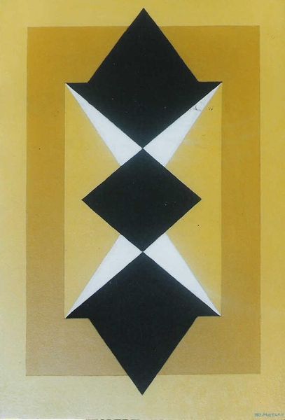 Curator: This work is titled "Three Lemons" created by Funasaka Yoshisuke in 1971, rendered in acrylic. Its simplicity has always intrigued me. Editor: Immediately, I'm drawn to the bold geometric shapes and colors—that salmon-y pink, the stark black rectangle, and the sunny, almost cartoonish, lemons. It’s so graphic and playful. I almost want to bite into it! Curator: Absolutely. It’s interesting to note how Yoshisuke utilizes geometric abstraction. One might consider the composition as a response to pop art's commentary on consumer culture, particularly within the context of post-war Japan. Editor: Consumer culture as depicted by citrus? Perhaps he's saying life gives you lemons and... make really aesthetically pleasing art? There's also something very cool about the negative space, like a spotlight highlighting their form. Curator: Precisely. The contrast serves to question the boundaries between the foreground and background, drawing the viewer's attention not only to the represented objects but also the relationship with their surroundings. How do you see this contrasting to the abstract movements in other areas of the world? Editor: The precision feels so Japanese, even with its clear pop art influences. Unlike Warhol's messy repetitions, these lemons seem placed deliberately, meditating on simple form, and suggesting order. And that order, of course, could suggest a very subversive social critique, wouldn’t you say? Curator: It could also be posited that these are symbols of health, wealth and fortune within certain Asian communities, an affirmation during uncertain social times. This contrasts against the strong use of colour more prevalent in western abstract movements, such as a vivid pop, but with a specific visual language in Japanese pop art style. Editor: Ultimately, "Three Lemons" leaves me with this lovely tension: is it frivolous and fun or subtly subversive and deeply thoughtful? Or maybe...can't it be both? Curator: It's precisely this multifaceted nature that keeps drawing me back to it. It exemplifies the socio-political concerns through a playful aesthetic, inviting continuous contemplation. Thank you for offering a brilliant insight into this dialogue between our perspectives.