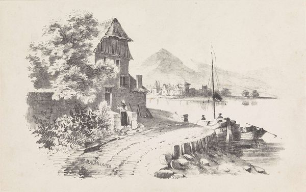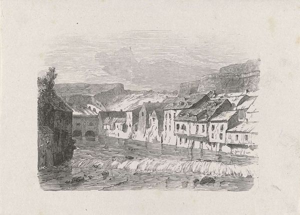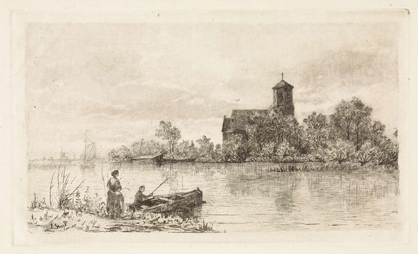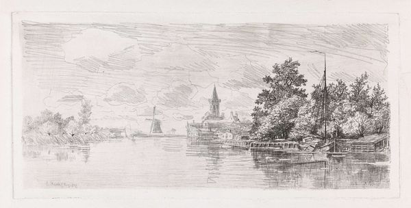 Curator: What a tranquil scene! There’s a lovely calm to this small print, isn't there? Editor: Absolutely, there’s a real stillness. The way the etched lines define the clouds and water… it’s incredibly delicate. Shall we give our listeners a bit of context? This is “Gezicht op Overschie,” or "View of Overschie", an etching by Isaac Weissenbruch. It likely dates between 1836 and 1912, and is now held at the Rijksmuseum. Curator: Thanks! Looking at the print, it really showcases Weissenbruch’s mastery of the etching technique. He wasn't merely recording the view, he was interested in texture. Consider how the roofs seem roughly layered. You can see his command of the needle on the copper plate, the control needed to achieve that level of detail and variation in tone. And the paper! Finding the right paper, with its particular weight and absorbency, was vital for receiving the ink and delivering the image Weissenbruch envisioned. Editor: Indeed. I also think about what Overschie might have represented at the time. We're viewing a specific locality, a nexus of people and stories. In what ways did the local residents relate to these images? Considering who would have had access to art like this helps uncover complex relationships within Dutch society and visual culture of that era. What narratives does it exclude or amplify through its selective depiction? Curator: It brings up interesting points about who controls visibility, and that can certainly be considered in relation to a landscape piece like this one. Editor: Absolutely. I look at the buildings—they're solid but humble, suggesting labor, perhaps the daily toil needed to run a small village. A community supported by agriculture and trade along this waterway, relying on a collective knowledge passed down through generations. Weissenbruch’s technique of etching brings attention to the textures and physical presence of the buildings, offering us more to consider, which is useful for a discourse around access and knowledge. Curator: Definitely. These physical connections become extremely important. To pull it all together, examining Weissenbruch's process – the materiality of the plate, the inking, the printing – offers invaluable insights, it deepens our understanding. Editor: Precisely. That understanding is, for me, inherently social and political, making even the quietest landscapes reverberate with the echoes of broader histories and struggles. Curator: What a remarkable journey – from material analysis to profound contextual understanding. Thanks for shedding new light on this print, I have something new to ponder. Editor: And thank you; I now see this landscape as a physical record embedded within history.