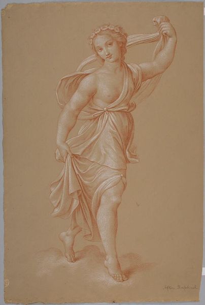 Editor: This drawing, "Mercury Carrying Psyche to Olympus, after Raphael," is attributed to August Temmel. It's quite striking in its simplicity, just the two figures rendered in sanguine chalk. What stands out to you about the materials and the process of creating this copy? Curator: It's interesting to consider Temmel's labor here. He's not creating a 'new' image, but reproducing Raphael's design. The value shifts from artistic innovation to the skill of replication, the physical act of translating Raphael's fresco. How does this impact our understanding of artistic value and consumption? Editor: That's a great point! It makes you think about the role of the artist as a craftsman, rather than just an originator. Thanks! Curator: Exactly. It's about labor, skill, and how these elements contribute to the artwork’s meaning within a broader economic and social context.