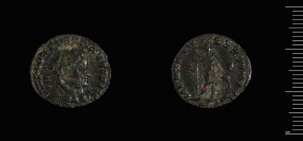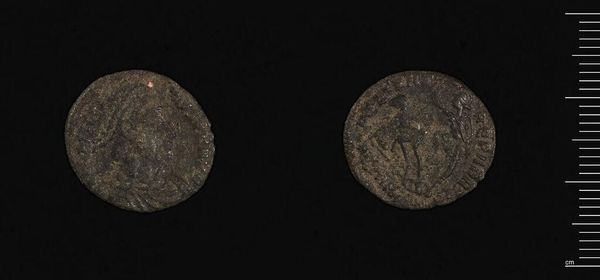 Editor: Here we have a Follis of Constantine I, seemingly from Arles. Looking at the coin's surfaces, I notice significant wear and patina, obscuring the details of the figures. What stands out to you compositionally? Curator: The coin presents a compelling study in relief. Note how the incised lines define the emperor's profile, contrasting with the figure on the reverse. The varying depths create a subtle play of light and shadow, animating the surface despite its degradation. Editor: So, the deliberate use of incised lines enhances the form, even now? Curator: Precisely. And observe the circular format—it dictates a specific compositional challenge. The artist's response is a careful balancing of textual elements around the central figures, reinforcing the coin's function as both art and communication. The texture is also very interesting. Editor: I see what you mean. I hadn't considered how the circular form dictates the design. It’s fascinating how much is communicated through such a small object! Curator: Indeed.