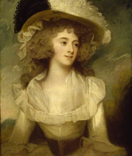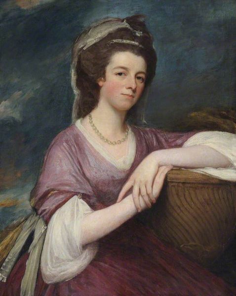 Curator: Romney's portrait "Miss Hariot Milles," completed in 1781 using oil paint, offers a compelling study in late 18th-century aristocratic portraiture. Editor: Immediately, I’m struck by the loose, almost dreamlike quality. The brushwork around her face seems intentionally soft, blurring the lines. There's a definite romantic sensibility at play. Curator: Absolutely, the way the artist employs soft brushstrokes and subtle gradations creates a sense of idealized beauty but what about the economic forces at play in it's creation? Think of the patronage system, Romney needing to flatter his clients. The labour involved in preparing the paints themselves… Editor: Agreed, the final result presents the composition in soft light that emanates around the subject's features, it appears he's striving for something ethereal and it comes through! Notice the color harmony of the gown: the white fabric, paired with muted blues, sets off the composition to be harmonious overall, drawing my eyes into her soft stare. Curator: And that informs our understanding, consider what we know about 18th-century fashion and its labor demands; each detail—the lace, the style of the gown—conveys wealth and status. Editor: Perhaps, though in terms of structure I see that Romney has presented this through a triangular composition, directing the gaze up the figure. This formal decision results in a naturalistic impression of her that is powerful as she leans against what seems to be a table, resting peacefully and posing elegantly for the artist. Curator: I would even expand on the significance of a seemingly minor item. Bracelets like hers, for example, were products of specialized craft, often made from imported materials, think of who profits, who is harmed, and where the resources come from for pieces such as these? Editor: In a nutshell, the romantic aesthetic of Miss Hariot Milles’ visage creates a delicate atmosphere—the result is one that draws me into its composition due to formal qualities alone! Curator: A powerful representation indeed, even knowing some of the complex structures and societal forces surrounding this creation of art is a great enhancement to an overall appreciation.