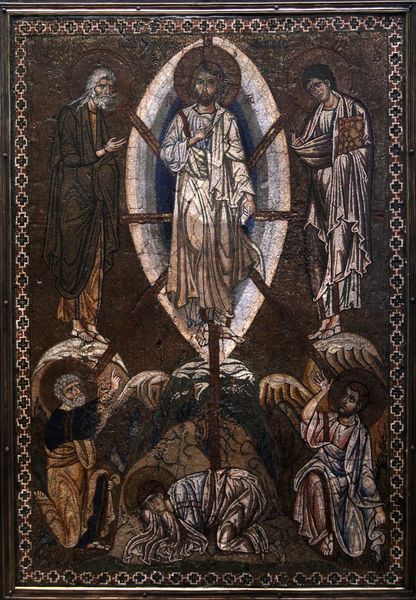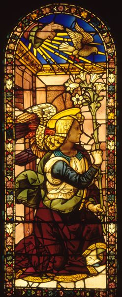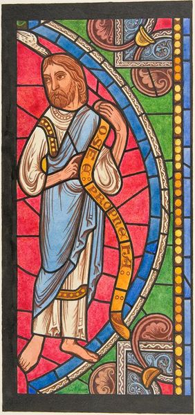 Curator: Looking at this image, the light emanating from within, I immediately sense a deep quietude. Editor: Here we have Aladar Korosfoi-Kriesch's 1918 stained glass piece, "The Good Pastor". Created at the close of the first World War, its vision of peace offers an interesting perspective during that chaotic era. Curator: Indeed. Notice how the figure of the Good Shepherd is intentionally presented against a glowing sun, emphasizing his spiritual importance, while the surrounding details reference back to a traditional Medieval visual language. Editor: I agree. But there's also a poignant narrative about leadership in crisis embedded within the design; during wartime, who is a shepherd and who is sheep, lost or being led? Curator: Ah, a powerful point. That reading certainly resonates considering Kriesch completed this amid war. The image itself builds on an old visual concept, drawing heavily from ancient iconography wherein the shepherd became an archetype for protective guidance. We find him gently guiding a lamb with that distinct shepherd's crook, the curves mimicking early Byzantine renderings. Editor: And one can easily see echoes of contemporary artistic trends in this, even as he deliberately nods to tradition. The shepherd’s serene expression, and how light washes over him—a deliberate use of radiance perhaps signaling sacrifice—can be construed as commentary of figures in leadership roles during wartime. Are these individuals, acting for better or for worse, also offering a potential ‘sacrifice’? Curator: It serves as a vivid reminder that the messages within stained glass stretch beyond devotional intentions; they capture nuanced cultural moods of their era. Editor: Agreed. Viewing "The Good Pastor," knowing its historical setting, deepens the questions this seemingly tranquil scene asks regarding those in authority and their subsequent influences in times of turmoil. Curator: And as we consider visual legacies over the centuries, that tension continues rippling outwards. Editor: Precisely. And it invites ongoing consideration.