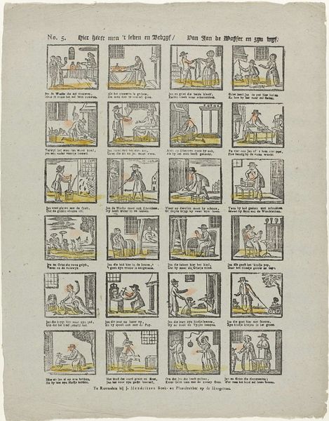 Curator: This print, "De nieuwe vermaakelijke Amsterdamze slagt-tijd" by Johannes Kannewet, likely from the mid-18th century, strikes me as a fascinating document of its time. It's a collection of these little scenes. Editor: Right, it almost looks like a cartoon strip! So, what's being "slagt" here? The title feels very…violent? How should we interpret this work? Curator: Indeed. "Slagt-tijd" here hints at a slaughtering or butchering of social norms, perhaps through satire. Look closely: each frame stages an aspect of Amsterdam life – markets, domestic scenes – maybe through a critical lens. What do you notice about who seems to hold power in these images? Editor: Some seem to depict everyday life but there are also scenes of injustice like the corporal punishments at the bottom. Do these violent scenes make a statement about power and society at the time? Curator: Exactly. And think about the context: the Dutch Golden Age, a period of immense wealth, but also stark inequality and rigid social structures. This print seems to offer a social commentary, maybe even a critique of those power dynamics through satire. The "slaughtering" is metaphorical – a takedown of societal conventions. This print is inviting the people to open their eyes to corruption, almost asking for resistance to the conventional expectations within Dutch society. What is not perfect about the Dutch golden age here? Editor: That's really interesting, framing it as a critique of Golden Age society. I had initially seen just small everyday life moments of 18th-century Amsterdam. I guess I missed the underlying tone. Curator: That is the intention. When observing a new artwork, use your cultural background, knowledge, and emotions to truly unpack the statement the work tries to get across. Consider how those perspectives would apply across social movements of that time!