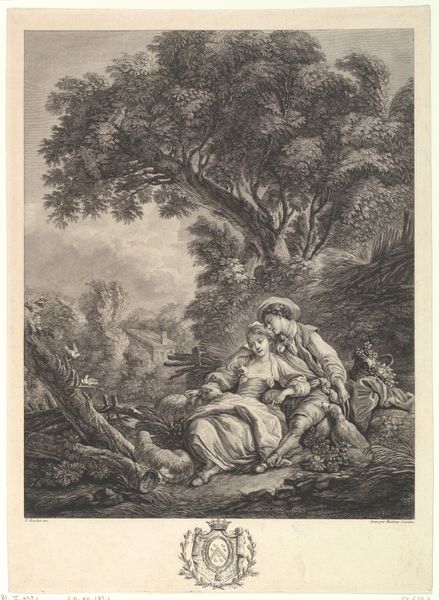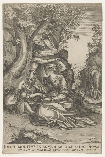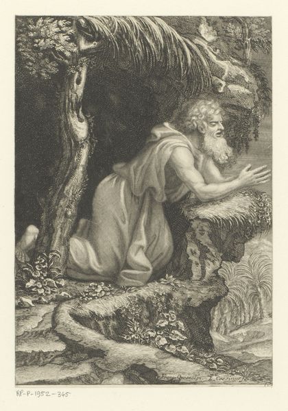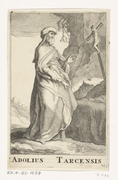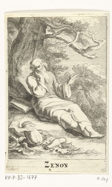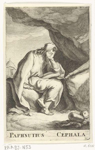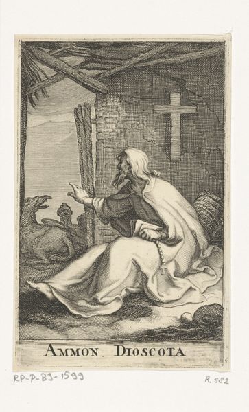 Curator: Look at this intriguing etching, "Heilige Cronius van de Cellen," or "Saint Cronius of the Cells," created sometime after 1636 by Frederick Bloemaert. It's part of the Rijksmuseum collection. Editor: It strikes me immediately as a portrait of contemplative sorrow, etched with a delicate hand. The weight of the ages seems to settle on the figure. What symbols are immediately grabbing your eye? Curator: Beyond the saint himself, engrossed in his book with a rather melancholic air, a stark skull rests beside a simple wooden cross. Below, a few terrestrial signifiers of an apple and bible surrounded by small flora. Given Bloemaert's focus on religious subjects, the etching likely participates in larger visual conversations surrounding spirituality in 17th-century Europe. Editor: The skull as a memento mori, of course, paired with the promise of salvation represented by the cross, drives home the transience of life against the eternal backdrop of faith. This engraving is rife with religious and Vanitas symbols of life, death, and resurrection in an orthodox fashion. What might his selection say about contemporary society in that period? Curator: Religious life was absolutely central to many communities, even within the rising merchant societies. Bloemaert was working during a time of immense social upheaval in the Netherlands and beyond. As such, representations of figures known for quiet contemplation and religious devotion arguably offered solace amid anxieties, potentially endorsing prevailing ideologies. The etching would have likely circulated as a mass produced object. Editor: That mass circulation would likely make its reception tied to the public, but how can the visuality connect to the public life of religion beyond personal introspection. Do these familiar symbols help shape shared cultural meanings, acting as a kind of shorthand for spiritual contemplation? Curator: Exactly. Think about it; this easily distributed artwork becomes a means of reinforcing and propagating societal values and expectations centered on devotion. Even small prints can shape public thought and reinforce hierarchies of power. Editor: These visual narratives contribute powerfully to the social fabric. Even in quiet acts of devotion, we're implicated in cultural discourses, thanks to the symbols embedded in artwork like Bloemaert’s etching. It leaves me contemplating the lasting influence images can wield. Curator: Indeed, reminding us of art's capacity to be both intensely personal and profoundly societal.