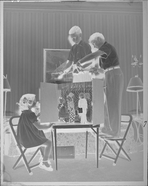 Editor: This photo, "Untitled (two boys with record player)" by Lucian and Mary Brown, is quite intimate. It feels like a captured memory. What symbols or recurring motifs do you notice here? Curator: The record player itself acts as a potent symbol. It represents youth, leisure, and access to a broader cultural world. Music is often a gateway to identity, isn't it? Editor: That makes sense. The boys are positioned so differently, almost as if reflecting two sides of engaging with the music. Curator: Precisely. One is active, selecting, and the other contemplative, absorbing. It recalls images of angels attending to a divine presence. Where does this interpretation sit with you? Editor: It’s not how I initially saw it, but I can see how the artists framed this moment to suggest a certain reverence for music and for the shared experience. Thanks!