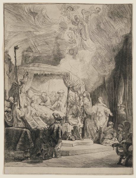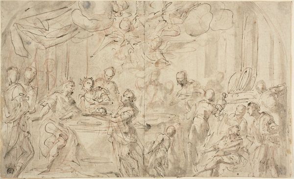 Curator: This evocative artwork gives us a glimpse into Blenheim Palace with its celebrated Marlborough Tapestries. The artist has captured the grand scale of the room in painterly strokes, allowing us to examine history through an intimate lens. Editor: It feels… unfinished, almost like a study. But even with its looseness, you can sense the weight of history pressing down in that room, all that gilt and those figures on horseback looming. Curator: Precisely! The figures you see depicted aren't just decoration, they illustrate the Duke of Marlborough's victories. Note how the artist emphasizes this theme by painting the very room within which they're housed. Think of the message that sends – a layering of triumph upon triumph, solidified within this palace. The oil paint mimics the textile look of the mural! Editor: I'm interested in how the painting presents the tapestries almost as characters themselves within the larger composition of the room. They become part of a visual record that has socio-political connotations beyond just art objects hung on a wall. Curator: Absolutely! They represent not just battles won, but a continuity of power and legacy. The symbols inherent in those scenes - the horses, the commanding figures - speak volumes about the self-image of the aristocracy, the historical narratives that justify their position, and its impact across generations. This work captures that moment in time where image, symbol, and the ruling class coalesced into one narrative, preserved through paint and canvas. Editor: It prompts one to consider who it represents and the power that dictates that only a limited number of figures in the room - figures on horseback - become the cultural memory and iconography passed down through painting, history, and imagery of this scale and political undertones. Curator: An astute point. Art is so rarely created in a vacuum. The artist isn’t just recording what is there, but also contributing to that ongoing historical narrative and asking for its perception of how people understand and react to its power and importance. Editor: It’s been revealing to look at those threads of context that connect an interior and its objects, to appreciate those painterly decisions that influence an historical legacy, as well as challenge those accepted perceptions.