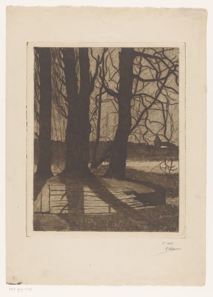 Frans Smissaert created this artwork called 'Crucifix naast boom' using etching. The composition is dominated by a stark contrast between the man-made crucifix and the organic form of the tree, set within a broader landscape. The lines are finely etched, creating a rich, textured surface that invites close inspection. The crucifix, a symbol of sacrifice and redemption, stands juxtaposed against the tree, a symbol of life and nature. This contrast destabilizes any singular interpretation, prompting a deeper consideration of faith and existence. The barren trees in the background, rendered with delicate lines, evoke a sense of desolation. Semiotically, the image is rich with cultural codes. The barrenness of the trees and the somber tone invite reflection on mortality, faith, and the human condition. The artwork functions as a discourse on how we perceive and interpret our place in the world, both aesthetically and philosophically.