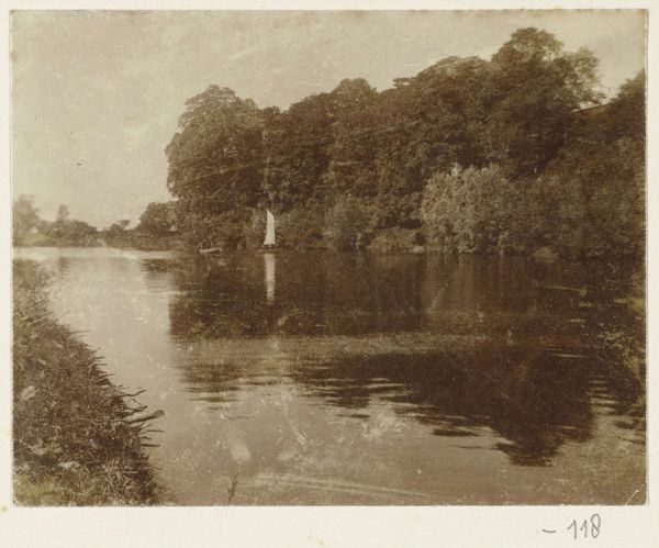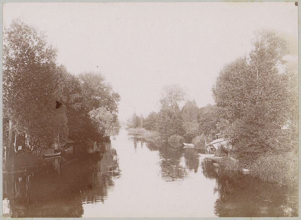 This photograph, titled *Gezicht op een water met begroeide oevers bij Montigny-sur-Loing*, was captured by Delizy, employing early photographic methods to frame a tranquil waterside scene. The sepia tones are the direct result of the chemical processes at play; it's all about the interaction of light-sensitive materials and development techniques. The soft focus and warm hues are inherent qualities of the medium itself, requiring precise timing. In its day, photography offered a novel way of capturing the world, but one that demanded specialized knowledge and equipment. The photographer's hand is evident not in brushstrokes, but in the careful manipulation of chemistry, light, and composition. It represents a shift towards industrialized image-making, but still required the practiced skill of an artisan. Photographs like this invite us to consider how technological advancements have shaped our perception, and how even seemingly objective records are imbued with the maker's choices and the era's aesthetic sensibilities. The photographic process, while seemingly removed from traditional 'craft', is itself a skilled practice deeply embedded in its own historical context.