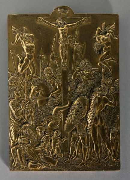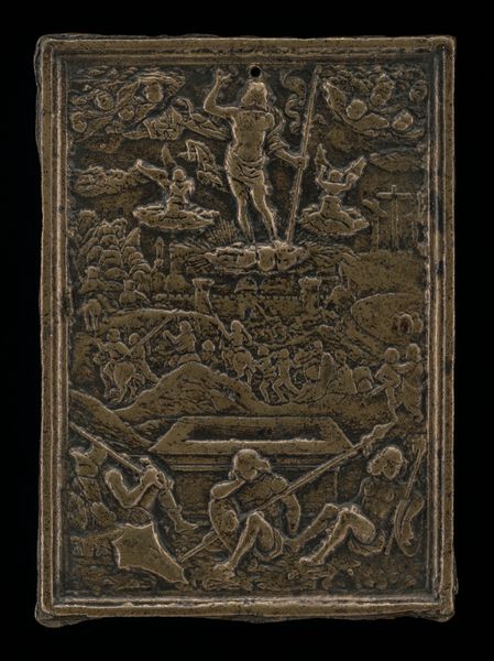 "The Resurrection" is a small bronze plaquette made in the 15th or 16th century by Master I.F.P., an artist active during the German Renaissance. During the Renaissance, religion continued to influence art. The story depicted here—Christ’s resurrection—is central to Christian belief, embodying themes of sacrifice, redemption, and spiritual triumph. However, consider the implications of portraying such a pivotal moment in a small, reproducible format. What does it mean to transform a spiritual event into a commodity? Notice Christ emerging powerfully, with a banner of victory, while Roman soldiers are scattered, rendered helpless. Traditional interpretations celebrate Christ's divinity, but we can also read it as a commentary on power, resistance, and the subjugation of earthly authority by spiritual conviction. How might an artist use religious imagery to convey a message of liberation or challenge the established order? This image invites us to consider the complex intersections of faith, power, and artistic expression during the Renaissance. It prompts us to reflect on the emotional and personal dimensions of religious belief and the ways in which art can serve as a conduit for spiritual experience.
