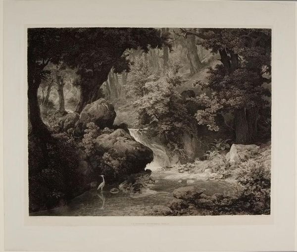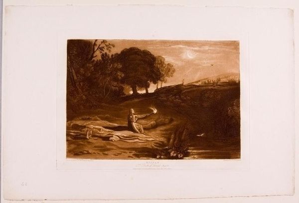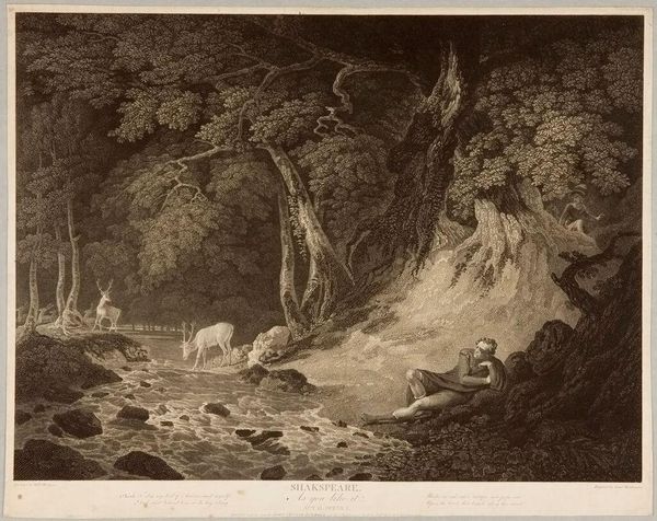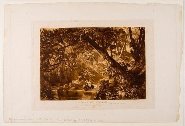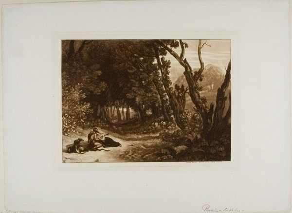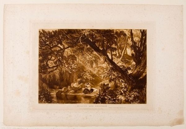 Curator: This is George Clint's "Procris and Cephalus," a print depicting a scene of love and tragedy. Editor: It's striking how the artist uses the sepia tones to create an almost melancholic atmosphere. The figures are nestled within this dense, shadowed forest. Curator: The printmaking process itself, likely etching or engraving, allows for such intricate detail in the foliage and the rendering of light and shadow. Consider how prints democratized art; they are multiples made for wider consumption. Editor: Yes, and the composition really draws your eye to the figures in the foreground, the dramatic lighting adds to the emotional intensity of the narrative. It is interesting the lack of idealization of the figures. Curator: Absolutely, and the print's accessibility meant that these stories, these visual narratives, could circulate widely, influencing popular understanding of classical mythology. Editor: Seeing how the technical execution works alongside the content, one starts to appreciate the piece for both its aesthetic and narrative qualities. Curator: Indeed, a blending of process and story that allows us to reflect on how images are created and disseminated.