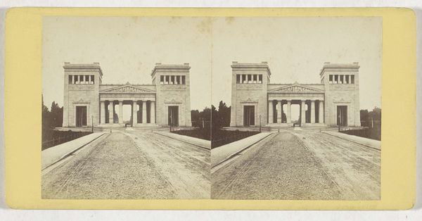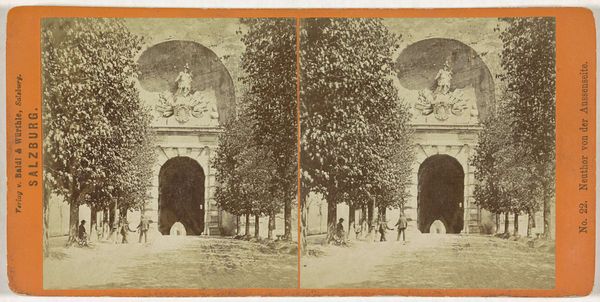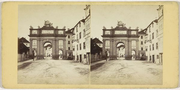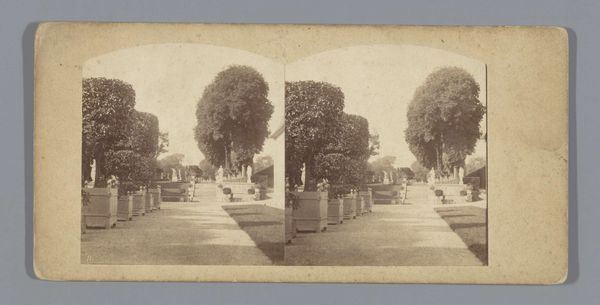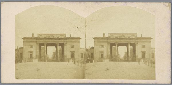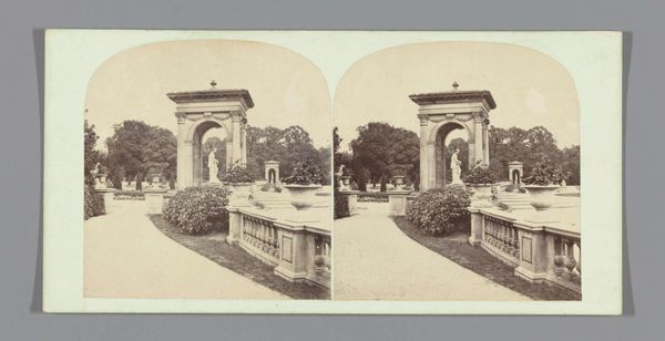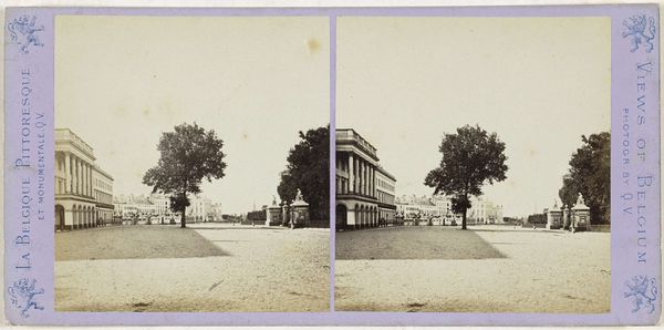 Editor: This stereo card features "Hertogstraat langs het Warandepark in Brussel," dating back to around 1866-1870, attributed to Jules Hippolyte Quév. I find the photographic print, with its watercolor and toned paper, produces a surprisingly calming effect. What can you tell me about its composition? Curator: Notice how the lines converge, leading your eye deep into the cityscape. The visual architecture dominates. The photographic medium has captured the scene's geometric structures. Note the strategic use of shadow. Do you see how it lends a sense of depth to the composition, particularly around the gate and stone lions? Editor: Yes, I see the contrasts in light. I’m wondering about the choice of such a sharp focus for the nearest architectural elements compared to the blurred architecture further down the street. Is this purely for visual effect or does it relate to a photographic technique common for the time? Curator: It highlights the receding perspective, further enhancing the feeling of depth. And that tension between sharp and blurred creates a certain dynamism. The visual weight, do you see, is concentrated near the bottom and left, the gaze is then drawn upward and to the right, to a destination not actually in view, which forces one to contemplate and imagine beyond the photograph itself. Editor: I hadn’t considered that. Now it seems like more than just a picture of a street. I realize now that analyzing visual structures gives clues that one could easily miss. Curator: Precisely. Every detail in form and placement can shape our reading and ultimately, our aesthetic experience of a work.