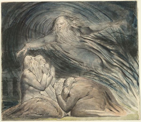 Curator: Here we have William Blake's "Elohim Creating Adam", housed right here at the Tate. It's undated, but scholars place it within his later period. Editor: My goodness, it's quite somber, isn't it? The swirling darkness and the weary expressions... It evokes a real sense of struggle. Curator: Absolutely. Blake often grappled with the darker aspects of creation. Note the musculature, the sheer physicality of Elohim bearing down upon Adam. It's not a gentle awakening. Editor: The linear precision is striking, especially when you consider Blake's mystical bent. It's as if he's dissecting the moment of creation, exposing its inherent tensions. And the serpent, coiled at Adam's feet—a potent symbol. Curator: Precisely. Blake uses the visual language of Genesis to explore his own complex theology, questioning power and the very nature of being. Editor: It's interesting how he renders both figures with such vulnerability, even Elohim seems burdened by the act of creation. Curator: It leaves you contemplating not just the biblical narrative, but Blake's own internal wrestling. Editor: Indeed, it's a reminder that even the most revered stories are ripe for reinterpretation, filtered through the lens of individual experience. Curator: A compellingly dark vision.