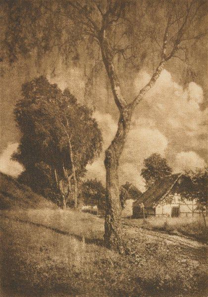 Curator: This evocative artwork, titled "A Village Corner," created sometime in the late 19th or early 20th century, comes to us from the hand of Theodor Hofmeister. He employed charcoal to render this landscape scene. What strikes you first? Editor: That huge, brooding tree almost eclipses the house entirely. It feels… weighted, like a storm's just passed or is about to break. The stark contrast heightens the sense of foreboding, doesn't it? Curator: Absolutely. The dominance of nature is a common Romantic theme. Look at the deliberate composition, how the artist positions the massive tree as a protector, or perhaps even a guardian, over the humble village dwelling. Editor: I wonder if it’s protective, though? The size makes me feel like its overbearing and even oppressive, casting the village in shadow. The home almost feels like a symbol of fragility set against the immense and timeless natural world. It feels, dare I say, gothic? Curator: I see that. There's certainly a psychological tension. Hofmeister seems less concerned with pictorial accuracy and more interested in mood. It reflects humanity’s relatively vulnerable place in the grand scheme. Notice, the trees dwarf the architectural feat of the little house. Editor: Right! Charcoal lends itself so well to expressing this mood, these layers of grays—the ethereal sky, the imposing trees—give a real sense of depth and mystery. All the windows of the building looking back, are dark empty squares… almost sinister, aren’t they? Curator: Precisely. The monochromatic palette also enhances the drama, stripping away any distractions of color. In that regard, consider how Hofmeister may be exploring deeper cultural memory through the contrasting symbolism. Light, representing enlightenment, battling with shadow, perhaps embodying ignorance or the unknown. Editor: And there we are… I am drawn into what the symbols mean, of home, security, and yet how everything around can also hold opposing darker implications. Curator: Indeed. It remains a wonderfully atmospheric piece and thought-provoking exploration of themes universal to our experience. Editor: Definitely. I’m looking into nature a bit differently now... slightly more anxiously!