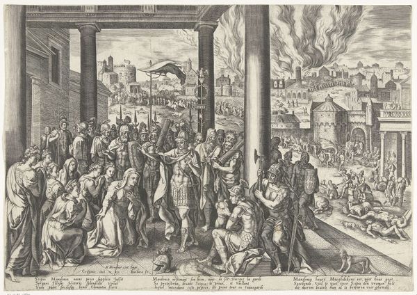 This print, titled *Idolatry of Solomon*, was created by an anonymous artist, its exact date unknown. The composition teems with figures and architecture, all rendered in meticulous detail. The foreground is dominated by several kneeling figures, seemingly in supplication or worship, set against a backdrop of densely packed crowds and elaborate buildings. This juxtaposition creates a sense of depth and complexity, inviting closer inspection of the structural elements. The artist employs line and form to convey a moral narrative about religious transgression. The linear precision used to depict the architecture and figures, might reflect a broader cultural emphasis on order and representation. This print functions as a moral allegory, using visual language to convey religious and ethical concepts. The structural arrangement of the scene, carefully balanced with an attention to detail, serves to underscore the underlying themes of faith, power, and the potential for moral corruption.