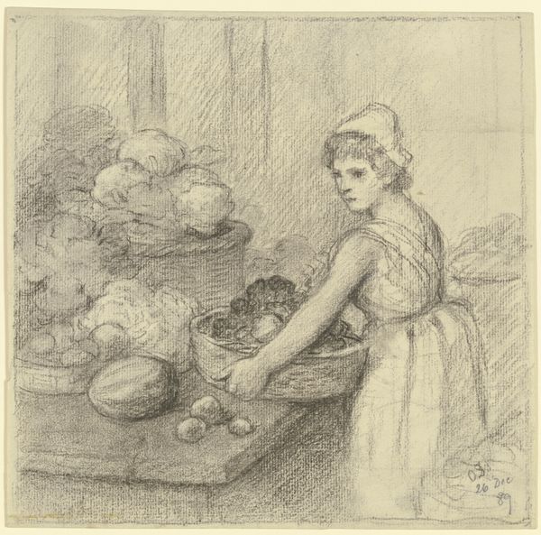 Otto Scholderer sketched this “Greengrocer” with pencil, a medium that lends itself well to capturing the immediacy of the moment. The headscarf, a seemingly simple piece of cloth, speaks volumes. Consider the veil, a symbol of modesty, yet also of protection, worn across cultures and epochs. One sees it echoed in the veils of Renaissance Madonnas, shielding them in sacred dignity. Yet here, on a common vendor, it suggests not divine purity but perhaps a humble virtue or a barrier against the gaze of the world. The act of veiling touches something deep within us, tapping into shared anxieties and desires related to concealment and revelation. Notice how the set of her eyes, juxtaposed with the veil, invites you to see beyond the surface, stirring an emotional response that transcends time. And so, the headscarf in Scholderer's sketch is not merely fabric but a vessel of cultural memory, a motif that continues to evolve.