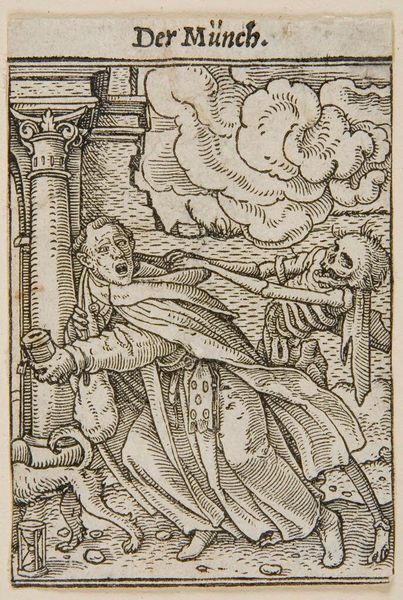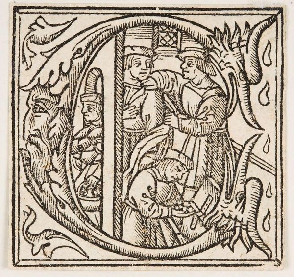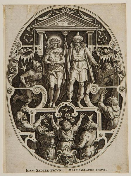 Editor: Here we have "Flagellation," an anonymous print held at the Harvard Art Museums. It's stark and unsettling, all in black and white lines. What do you see in this piece? Curator: It hits you, doesn’t it? The raw, almost brutal honesty. I see the fragility of the human form contrasted with the rigid lines of the architecture and the viciousness in the figures’ stance. It’s a dance of power, isn’t it? A story etched in pain, where the line between the sacred and the profane blurs. What do you make of that decorative border? Editor: I hadn’t really thought about it, but it's such a contrast to the scene inside. Maybe it's trying to frame the event, make it palatable? Curator: Maybe so. It reminds us that even in the darkest moments, life—or art—finds a way to decorate the edges, doesn't it? It’s a chilling thought. Editor: This really adds another layer of complexity. I see it differently now.
