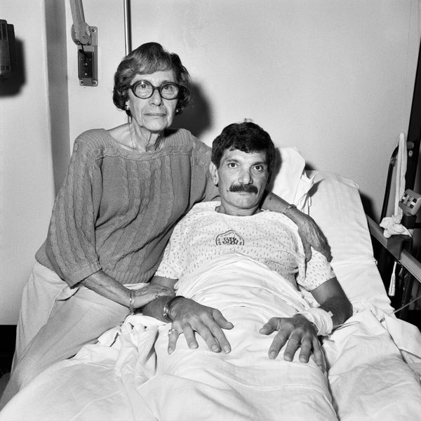 Rosalind Solomon made this photo, called *New York,* and its undated. It’s a study in black and white, in shades of grey. Look at the way the light falls across the scene. It's stark, unforgiving, revealing the textures of the bedsheets, the skin, the folds in the clothing. The process here is one of capture, a pure record of a moment. See how the graininess of the image adds to its emotional weight. It's not polished or slick. It's raw, like a wound. The photograph feels deeply intimate. The two figures connected, one strong, the other weaker. The younger man is caring, tender. The older man is the poet, Allen Ginsberg. The details of the hands, clasped together, say everything. This reminds me of Nan Goldin's unflinching gaze, that unflinching recording of difficult moments and that conversation, across time, about living and loss.