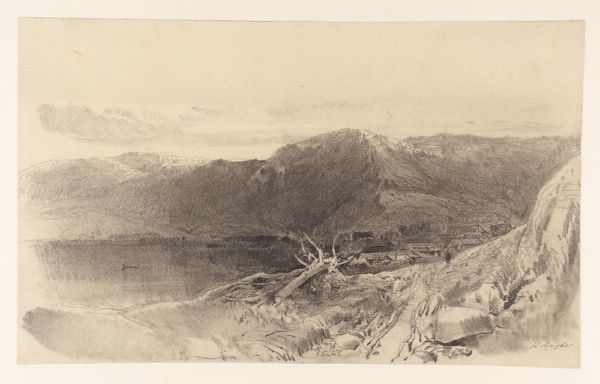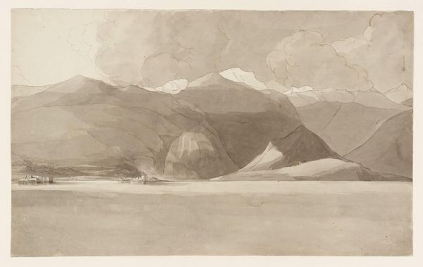 Curator: Oh, I find this so peaceful. It almost feels like a memory, a half-forgotten dream of a place I once knew. Editor: This is Edward Dayes' "View across a Lake with Hills Beyond, Probably in the Lake District", made with pencil and watercolor. It resides at the Tate. The vastness of the uncolored sky contrasting with the delicate rendering of the landscape is fascinating, don’t you think? Curator: It is. I'm drawn to the muted tones. It evokes a sense of stillness, almost like holding your breath in anticipation. But I feel there is more beyond the landscape. Editor: Dayes was working during a period of intense social and political change. The Lake District itself became a site of contested ownership and romanticization. This image seems to reflect this tension. Are we really seeing the landscape itself or a carefully constructed ideal? Curator: Maybe it's both? The dream of a space, fraught with the struggles of the real. Editor: Precisely. It reminds us that our perceptions of nature are always mediated by culture and power. Curator: Thank you for sharing this perspective. It does change the way I read the work. Editor: And thank you for the opportunity to see it anew, through your eyes.