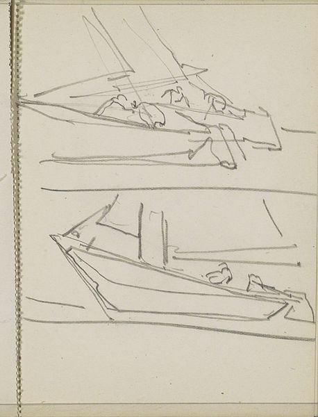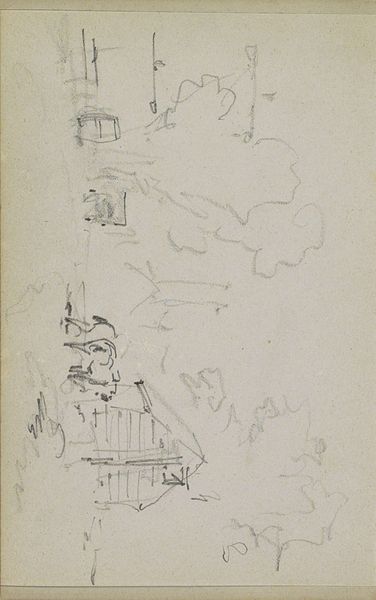 Adrianus Eversen made this pencil sketch, "Gezicht op een straat en een roeiboot", offering a glimpse into his artistic process. The work is divided into two distinct registers, each presenting a scene with remarkable economy. The upper section features a boat, rendered with a few well-placed lines, suggesting form and volume with minimal detail. The lower section depicts buildings along a street, again sketched with a lightness that captures their essence without elaborate description. Eversen uses line to define the architectural space, hinting at the structures' depth and character. The sketch's aesthetic lies in its simplicity and the structural framework it provides. It destabilizes the conventional notion of finished artwork, inviting viewers to engage with the preliminary stages of artistic creation. It is through this engagement with the artist's initial vision that we understand how Eversen constructs his world, reducing it to its most fundamental elements.