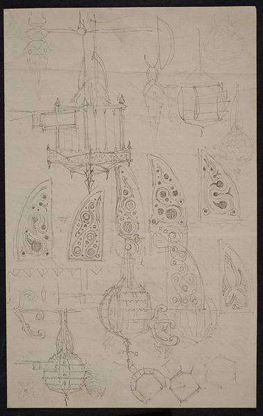 Editor: So, here we have "Grave Monument, chairs, cupboards, a bed and sofa," a sketch by Pierre Joseph Hubert Cuypers from around 1850. It's on paper, part of a sketchbook, and the light touch makes it appear ephemeral. What do you see here beyond architectural drawings? Curator: Immediately, I'm struck by the depiction of the grave monument at the sketchbook's center – its intended symbolic resonance looms even in this initial draft. Look at the implied weight, the attempt to immortalize through structure. It sits amidst drawings of domestic furnishings. What emotional narrative is suggested when considering both life and death so directly? Editor: I hadn’t thought about the connection between them that way! The furniture now feels…almost like props in a play about mortality? Curator: Precisely! Cuypers is playing with familiar images here: chairs, beds. But they’re studies, detached, almost ghostly on the page, adjacent to what endures beyond daily use, and the implication ripples across time, invoking cultural anxieties around death, legacy, and memory. What do you make of its placement in the composition, across the two pages? Editor: It seems to almost divide the domestic, the familiar, and the memorial. One informs the other, maybe. Was Cuypers hinting at how we define ourselves through our belongings, even after death? Curator: That’s it! By placing the tomb within arm’s reach of mundane household objects, Cuypers challenges us to question their deeper significance. Are they simply comforts or building blocks of an enduring memory, defining who we were in life as part of what persists after? Editor: This sketch offers so much more than just an architect’s blueprint. Thanks! Curator: Indeed, it offers a peek into a 19th-century mind grappling with themes of domesticity and mortality that continue to resonate today. A wonderful object lesson in how symbols shift in meaning over time.