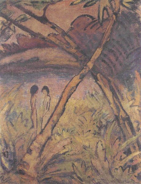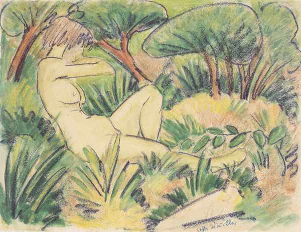 Editor: Here we have Otto Mueller's "Waldlandschaft Mit Akt," or "Wooded Landscape with Nude," a watercolor painting from 1924. It strikes me as almost dreamlike; the colours are muted, and the human figure blends subtly into the natural world. What do you see in this piece? Curator: What stands out to me is how Mueller is actively flattening the hierarchy between the human form and its environment. Consider the watercolor technique itself: a medium often associated with spontaneity and immediacy, used here to depict both the female nude and the encompassing forest with equal, understated detail. He isn't just placing a figure *within* a landscape. Rather, the landscape is actively *making* the figure, through the act of representation. Editor: That's interesting. So you're suggesting the materials themselves contribute to the meaning? Curator: Absolutely. And not just the watercolor. Think about the paper. It's the literal support for this entire scene. The production of that paper, the accessibility of watercolor paints, the act of Mueller choosing this medium over, say, oil – these choices materially impact how we understand the relationship between the figure, the artist, and the viewer. Do you see how this blurring speaks to early twentieth-century ideas of the self? Editor: I do. So rather than viewing this as just a pretty landscape, it's an engagement with broader social ideas through material choices. It changes the perspective on artistic intent and the artistic product itself. Curator: Precisely. Examining the ‘how’ reveals so much more about the ‘why’. Editor: Thank you! I never thought about landscapes and nudes this way before. Curator: Materiality offers such valuable lessons about power, labor and intent!