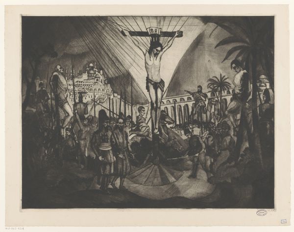 Curator: Look at this etching by Rembrandt van Rijn, "Christ Crucified between the Two Thieves: The Three Crosses," created in 1653. Editor: It's intensely dramatic! The darkness is almost overwhelming, punctuated by stark highlights. The scene feels vast and chaotic, full of movement despite being a still image. Curator: Rembrandt was deeply interested in conveying psychological states. What's interesting here is the intersection of high drama with the etching medium. Printmaking at this time was becoming increasingly widespread as an important avenue of accessing images for a broader public. Editor: Absolutely. The darkness becomes a potent symbol. The deep shadows and contrasted light evoke both spiritual darkness and the revealing light of grace. It resonates with traditional depictions of the crucifixion, especially the symbolism around sacrifice. Notice how Rembrandt emphasizes the beams of light, as divine illumination and as almost a theatrical spotlight, and consider how both create meaning. Curator: And think about the socio-political element. By emphasizing certain parts of the narrative in stark contrast with others, Rembrandt creates a subjective account of a universally-understood historical event, thus asking us to reconsider traditional authority at the time. Editor: The suffering of Christ is rendered with incredible pathos and the contrast creates an emotional depth that asks us to witness. We almost see a glimmer of hope amid the overwhelming darkness. Curator: It is through those subjective choices, those points of focus and ambiguity, that art begins to have its function within the public realm and take on a political character, subtly asking the viewer to make judgements, to question the status quo, to empathize with an alternate account of things. Editor: The light certainly creates a moment of shared human experience. Curator: A striking statement on human nature in Rembrandt's time, achieved through mastering this artistic medium. Editor: Yes, Rembrandt created an intensely iconic and emotive statement through imagery that invites personal and shared reflection.