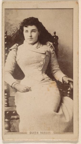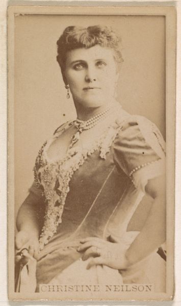 Curator: Just look at the composition of this image. This is Pierre Sayve's "Portret van een onbekende vrouw," a gelatin-silver print circa 1890 to 1895. It has such a subdued feeling to it. Editor: Yes! Something so tender, the tones have a softness that almost diffuses her very presence. Curator: The tones certainly evoke that. Sayve utilizes this subtle palette so skillfully. What do you see in terms of structural elements? The framing, perhaps? Editor: Her positioning in the shot and the details of the composition – the soft ruffles around her neck, the delicate wisps of hair around her face – create a captivating balance between grandeur and intimacy. Curator: Exactly. The way she leans gently against that faux column creates such a posed grace. Sayve really captures the poise of the era, don't you think? But there's a personal quality here, as well, almost melancholic. Editor: Absolutely. It makes me wonder who she was! What were her dreams, her fears? The way she holds her hands... almost a little closed-off. There is also the material and production method -the soft, dreamy aesthetic owes something to the impressionist sensibilities that photography seemed to mimic during this time. Curator: Very much so. The almost painterly use of light lends that quality. This isn’t just a straightforward documentation. There is artifice at work. Editor: Indeed. This isn't just about capturing a likeness; it's about crafting an image, an impression of a person, playing with allusions. Even the historical fashion gives the portrait depth. Curator: I appreciate your reading into the depth. Sayve definitely crafted a small mystery with the inclusion, or lack thereof, of contextualization. Editor: Agreed. Looking closer, the texture and tone of the photograph is also what makes me think about fragility and quiet resilience. This woman, immortalized. Curator: You put into words perfectly how this piece moves beyond its materiality into emotional resonance. A poignant portrait that offers quiet intrigue.