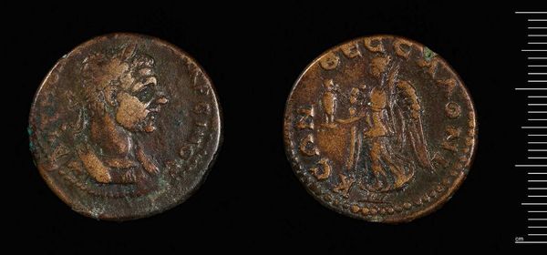 Editor: This object is a coin featuring Antoninus Pius, presently residing at the Harvard Art Museums. It appears quite weathered, which gives it a solemn feel. What strikes you first when analyzing the intrinsic qualities of this piece? Curator: The coin's circular form immediately defines its structure. Observe how the raised relief of Antoninus Pius and the figure on the reverse side interact with this predefined boundary. The patinated surface, a result of age and oxidation, introduces a complex interplay of color, ranging from deep browns to subtle greens. Editor: The weathering seems to obscure some details. Does this affect the reading of the artwork? Curator: Indeed, the obscuration of detail compels us to consider the passage of time as an integral element of its composition. The damage, in a sense, becomes part of its narrative, a visual metaphor for the impermanence of power and the decay of material culture. Do you notice how the figure's pose and drapery create a vertical thrust, contrasting with the circular frame? Editor: Yes, now I see it. It's amazing how much you can see just by looking at the form. Curator: Precisely. By closely examining the inherent visual elements, we gain insight into the artwork's essence, transcending its historical context.