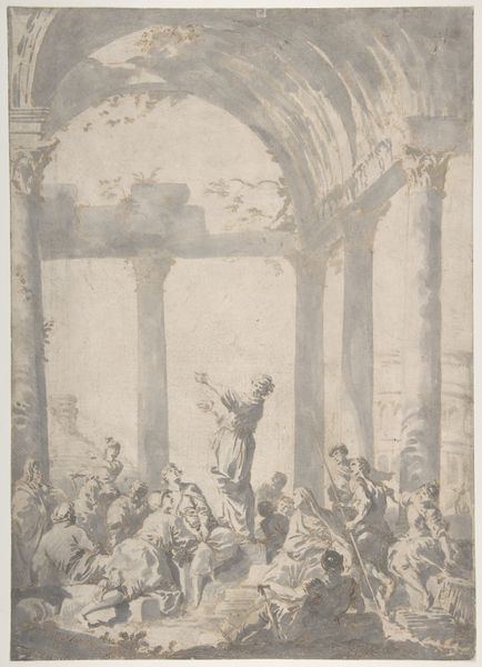 In the autumn of 1816, when the young Théodore Géricault set off for Italy, he did so without the usual scholarship from the Académie. He spent his almost year-long stay in Rome in a corresponding degree of independence from the demands of Classicism. During this time he focused his attention not only on art, but also on the pulsating everyday life in the streets of the city. The artist may have seen a similarly carefree 'tarantella' in the midst of musicians and spectators. But it only inspired him to lend a broad motif a universally valid significance in a drawing executed in the style of a picture.In the open-air celebration with music and dancing shown here, the artist has created a well-thought-out synthesis of natural-looking and carefully chosen ideal forms. The arrangement of the figures in the foreground clearly takes up the circular movement of the dance. It spreads downwards from the leading guitar player standing higher than the others, to the man playing the triangle, via the large, imposing figure with his back turned to the viewer and, following the gaze of the man sitting in an antique pose, then moves upwards again towards the dancing couple, before climaxing in their whirling around of the raised tambourine. The architectural background is a backdrop constructed by the artist and composed of the remains of an ancient portico with Corinthian pillars, a medieval campanile and a Baroque-looking building complex. No clue as to a specific location is provided either by the buildings from different eras - from antiquity, the Middle Ages and the Baroque - or by the lofty mountain range in the distance. This is in fact a 'capriccio', which turns a folkloristic subject into a modern Dionysian maenad dance.The decisive factor for the systematic coherence and energy of this drawing is the chiaroscuro, employed in addition to the linear chalk drawing. It clearly shows the artist's appreciation of sculptural values and of the effect of strong contrasts between light and dark. The distribution of white gouache and brown wash creates a lively alternation of dazzling contre-jour and shadow, which supports the atmosphere created by the low-lying sun of the early evening and the dynamism of the event. Thanks to its technical brilliance and the masterly translation of the experience of reality into an idealised composition, the French artist's drawing represents an important counterbalance to the Nazarene draughtsmanship of Franz Pforr and Peter Cornelius within the field of nineteenth-century art at the Städel's Collection of Prints and Drawings.