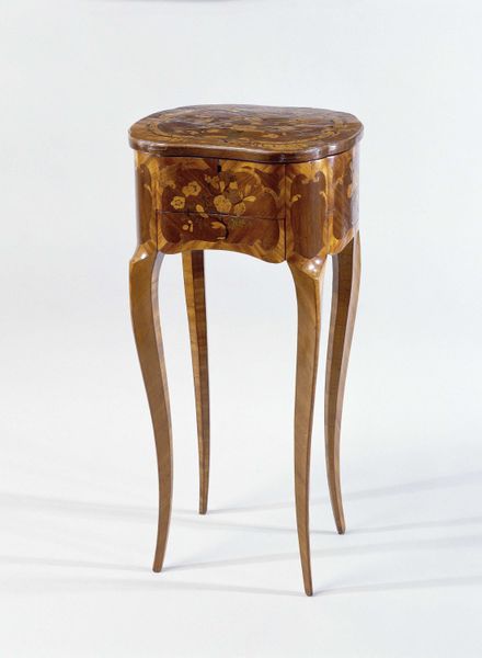 Curator: Allow me to introduce this "Oblong Table" crafted from wood and metal, dating back to the period between 1760 and 1770. It's currently held here at the Metropolitan Museum of Art. Editor: It has a beautiful silhouette. There is a remarkable lightness despite the dense materiality, wood being the key here, a kind of upward movement conveyed through those curved legs. I notice how each part connects, and its detailing shows purposefulness, creating rhythm. Curator: Indeed, the piece exemplifies the Rococo style through and through. The shape and structure of the table is definitely notable here. I can imagine this gracing a lavish 18th-century salon. Its placement wasn’t arbitrary; these pieces signaled a move towards lighter, more ornamental forms. The elite wanted to separate themselves from traditional designs of their furniture. Editor: The question remains, however, how well does this "Oblong Table" conform to more established furniture typologies, or is it creating a space that is utterly its own through design? And if it seeks differentiation, why? The marquetry on the drawer and legs appears deliberate in breaking patterns that would normally emerge. This object speaks against any formal definition through structure. Curator: Absolutely, this particular style of ornamentation serves a purpose. I interpret its composition through Lacan’s ideas around mirrors: objects mirror their observers. The question here isn't what is being observed, but how those surfaces define space, reflect back notions of luxury, of good taste, wealth and ultimately political power? Editor: Yes. But I find it too decadent in an era defined by colonial conquest; this decadence would require material conditions wrought through terrible violence. I understand beauty doesn't automatically signal morality, and I enjoy how the composition has defied formalistic constraints. Curator: Well, by interrogating the power structures mirrored in the material object, we hope it may help question not just aesthetics but our own worldviews, as well. Editor: I agree. It has to be this piece’s ability to push boundaries, defy clear categorisation and elicit such historical context. Its shape isn't random, after all; this speaks not just of design, but of larger structures.