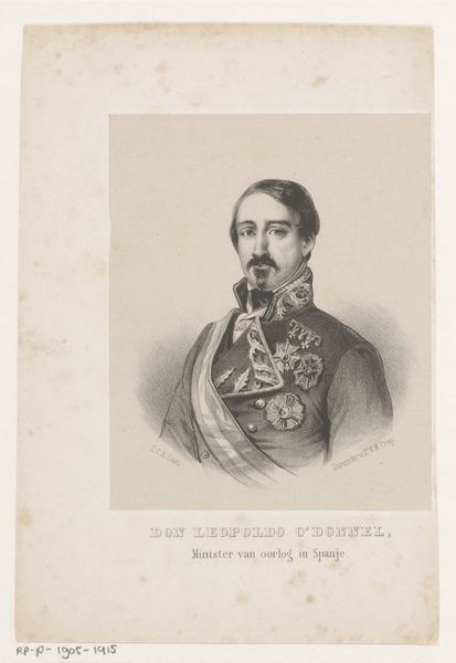Curator: This is a portrait of Ferdinand Maria of Savoy-Carignano, produced as a print in 1848 by Luigi Mantovani. It's a fascinating example of romantic portraiture. Editor: My first impression is one of restraint despite the finery. The monochromatic palette and the meticulous engraving lend a formal air. Curator: Absolutely. Engravings like this were a powerful tool for disseminating images of authority and solidifying dynastic identities. Look at the precision in rendering his uniform; the details become symbolic of his power. The medals, the sash—each an icon in its own right. Editor: Yes, the distribution of light is interesting. There's a softness around his face that contrasts sharply with the precise delineation of his attire. Almost as though we are meant to observe an inner persona, distinct from external office. The figure dominates, positioned at the work's center with surrounding negative space forcing a concentrated visual encounter. Curator: Precisely! It highlights the tension between his public persona and inner self, the very thing that romanticism sought to explore. The laurel wreath motif could evoke both victory and perhaps, aspirations linked to classical ideals. He embodies the complicated spirit of the era in which liberalism, nationalism, and tradition were in contention. Editor: There is almost a lack of dynamic tonal contrast that seems almost too simple considering the highly ornamented sitter; it’s interesting how Mantovani employed light. What do you see when you reflect on Mantovani’s overall compositional choice? Curator: Considering Mantovani’s historical placement, perhaps Mantovani had to walk the fine line between realism and artistic idealization to achieve that very image: a prince representing duty in service, embodying romantic yearning, and perhaps nostalgia too. Editor: That seems probable to me. On second viewing, it's compelling how the artist uses this medium to capture both the sitter's individual likeness, yet also embody cultural identity and legacy that would resound in his time.