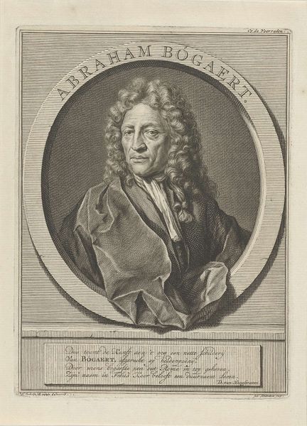 Curator: Here we see Balthasar Vogel's 1712 engraving, "Portret van Pierre Dionis." My first impression? There’s a restrained, almost academic quality to the linework, yet a liveliness persists within the subject’s expression. Editor: The work's historical context really shapes my understanding. Dionis was a prominent surgeon—a figure who navigated both the refined court of Louis XIV and the gritty reality of medicine. These portrait prints helped circulate images of influential individuals, solidifying their public persona. Curator: Precisely, it's fascinating how the baroque sensibility is translated through the graphic precision of the engraving technique. Observe the contrasting textures, from the meticulous curls of the wig to the smoother areas suggesting light on his face. It's an intricate network of marks. Editor: And this carefully crafted image has power. It subtly reinforces societal hierarchies, representing Dionis as a man of learning and status. The very act of commissioning and circulating such a portrait affirmed his position. I see it in light of class relations during that time. Curator: Perhaps. However, I'm particularly interested in the composition. The oval frame constrains and focuses our attention on the head and shoulders. The limited range of tonal values directs focus to form. It makes one truly see the artistic choices at play. Editor: Indeed. While acknowledging its artistic merit, let's remember that prints like this served as important vehicles of information. Consider the print shop as a sort of 18th-century social media network. These portraits performed a clear function. Curator: The very deliberate artistry, carefully weighed and considered for lasting impact. The detail speaks to a sustained engagement by both artist and sitter. It goes beyond simple reportage. Editor: Looking back, it becomes obvious this portrait operates on several levels—personal promotion, artistic achievement, and reflection of historical standing. Thank you for pointing to those important artistic achievements. Curator: Thank you; the discussion was stimulating. This piece is a reminder of the dialogue between form and culture inherent in all art.