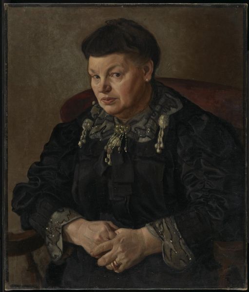 Curator: We're looking at Ilya Repin's "Portrait of A. Bocharova, artist's aunts," painted in 1859. Editor: There's such directness in her gaze! A quiet power, I'd say. But she also seems somehow resigned. Is it just the low light? Curator: Repin, though just a teenager, has already begun his intense study of character through light and shadow. Notice how the dark backdrop focuses all attention on her face and hands. And then that intricately patterned shawl—what do you make of that? Editor: I'm immediately drawn to the labor embedded in that shawl. The embroidery, the fabric itself—it speaks of domestic industry, the kind of painstaking work often unseen and undervalued. Probably made at home. That textile situates her within a world of making and doing. Curator: I find the color palette fascinating. The shawl injects such vibrance and richness. Without that one particular element the artwork would convey a very different emotion. It highlights a different layer to her. It adds character and complexity. And, interestingly, serves almost as a shield. Editor: Absolutely. The shawl offers comfort but also veils a layer of her interior life, hiding a lot about this unknown person. Was this artist merely observing or actually reflecting upon their position in society? Perhaps both, I'm sure it also gave employment opportunities to the artisan creating such garments, and they would have held considerable economic importance to the subject and the household in which they reside. Curator: It's funny you say that because despite its straightforward realism, there's something almost theatrical about it. I almost feel that this woman is trying to portray a very specific sense of respectability, and authority. Editor: Precisely. Everything, from the shawl to the tight, folded hands, contributes to that performance. Even her hair! I find myself trying to envision how something similar would manifest in contemporary times… Interesting to observe. Curator: It is isn’t it! Something like this, I believe, has a timeless effect; a lingering, evocative gaze. A lot is unspoken but very, very loudly present. Editor: I concur; it truly underscores how even the simplest garments have profound meaning and that even paintings such as these, on the face of it seeming quiet and unassuming, can offer a depth and understanding into social norms and cultural practices that endure throughout time.