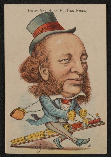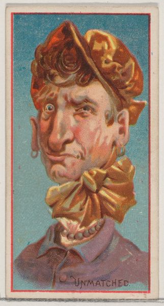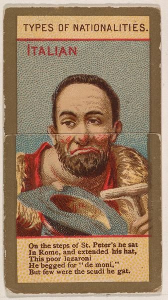 Curator: This striking portrait comes from a series produced by Kinney Brothers Tobacco Company around 1890, titled "Types of Nationalities," and this one's labelled "Yankee." It is a colored-pencil print drawing, now held in the collection of the Metropolitan Museum of Art. Editor: My immediate impression is the intense focus on the figure's head and gesturing hand. The artist has really highlighted the texture of the hair and beard, there is so much more detail there than in the figure's clothes or the background. Curator: The rendering does favor realism, though it is certainly idealized, and slightly caricatured to underscore a regional stereotype. Note the flattened, almost two-dimensional treatment of the patterned shirt compared to the attempt at a tactile quality to the man's stubble. Editor: I'm particularly drawn to that. Kinney Brothers' mass production of these cards transforms art into something circulating within a network of material exchange. We have this portrait of a “Yankee” produced, consumed, and discarded alongside tobacco—what kind of portrait does it provide through this industrial chain? Curator: Precisely, the image serves a function. In this instance, the compositional strategy isolates a singular “type” and presents him to be understood. The foregrounding creates a reading predicated on readily accessible and legible visual signs, perhaps reflecting the then-prevalent notion of American identity. Editor: Consider the cost and distribution. Colored pencil was relatively cheap, aiding large production. Disseminated through tobacco products, the portrait enters diverse hands. Therefore, it also begs questions about representation: who produced this “Yankee” and for whom? Curator: A good point to bring up. As a collectible inserted within a widely purchased item, "Yankee" presents an image tailored to reinforce specific notions for the consumers, even at the cost of perpetuating caricatured images. The text below also lends itself to certain attributes regarding those identifying as 'Yankee'. Editor: Definitely. Reflecting on the method of production alongside its cultural content invites contemplation about this Yankee—not as an artistic interpretation, but an artifact embedded within socio-economic currents. Curator: Indeed, viewing this "Yankee" allows us to grasp the aesthetic composition of art, while contextualizing it enables us to understand the interplay of design and fabrication.