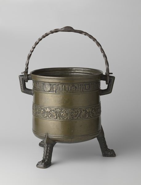 Editor: So here we have an andiron with cooking pots and a pair of fire tongs, dating back to between 1590 and 1596. It’s unsigned, sitting here at the Rijksmuseum. It feels… strangely industrial for the time, but also wonderfully battered, you know? What stories do you think this thing could tell? Curator: Ah, yes, it does possess that time-worn character, doesn't it? You almost expect the embers to glow as you look. When I see this, I imagine raucous laughter around a crackling fire in a bustling, candlelit kitchen. This andiron, likely forged from iron – you can almost smell the metallic tang even now – was never meant to be precious. These aren’t decorative objects in the modern sense, no art for art's sake. What purpose did they have beyond cooking? Editor: Protection, maybe? Like, keeping the fire contained and stable? Curator: Indeed! Consider the social tapestry woven around that hearth. Meals weren't mere sustenance; they were communal events. Negotiations were had. Tales were told. Bonds were forged as they waited, famished, for the soup. This andiron… was the stage. Almost sculptural, would you say? Editor: Definitely sculptural! Especially with that unexpected dent halfway down. It’s got this fantastic wonkiness to it. And those little rivet details—a rough-hewn beauty, I think. Curator: Yes! Mannerism embraces artifice over naturalism. Did the dent get there on purpose? We'll never know, maybe? It just somehow happened. In either case, it invites us to imagine its creation, or what the cooking space would have been like, almost as clearly as smelling woodsmoke from the grate itself. What does *that* image bring to mind, now? Editor: Just… how useful it looks! Knowing people actually used this—touched it, smelled it—it feels much closer than if it had been behind glass, or untouchable. Curator: Precisely! It lives still! Thank you, now I, too, will think of the scent of woodsmoke every time I visit it!