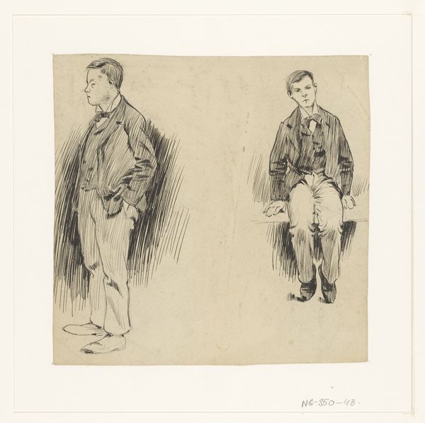 Jan de Waardt created this work, "Buiten Amsterdam" or "Outside Amsterdam," using black chalk on paper. Dominating this work is the use of chiaroscuro, where stark contrasts between light and shadow render the figures with a heavy and somber quality. Observe the figures of a man and a boy, walking against a stark horizon. The artist's application of bold, deliberate lines creates a sense of weight and presence. This approach reflects a broader artistic concern of the period, where artists sought to capture the essence of the human condition through simplified forms. The absence of color emphasizes the structural elements—the lines and forms—inviting us to consider how these elements function within the composition. The spatial arrangement, with the figures set against a distant cityscape, creates a dynamic between the intimate and the expansive. Consider how De Waardt uses these formal techniques to create an image that is not just aesthetically compelling, but also deeply rooted in cultural narratives.