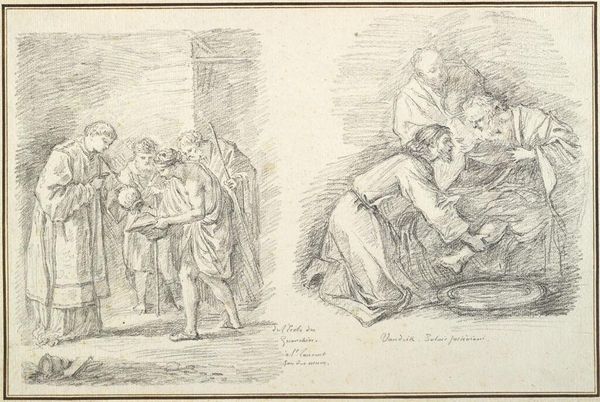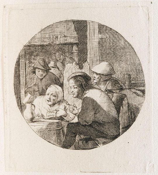 Curator: This is "Looking for Fleas" by Jacques Dassonville, created sometime between his birth in 1614 and death in 1675. Editor: It’s a rather unsettling little scene; the subject’s expression is caught between anguish and resignation. Curator: Indeed. Dassonville’s cross-hatching technique builds a chiaroscuro effect despite the simple lines. Notice how the composition directs our gaze from the focused search to the onlookers, trapped within this intimate moment. Editor: The image speaks to the everyday realities of life, doesn’t it? Perhaps reflecting broader social anxieties of the time regarding hygiene and class. Curator: Certainly, the piece offers a glimpse into domestic life. Ultimately, it’s the stark humanity captured within the framework of the image that's compelling. Editor: A potent, if somewhat uncomfortable, reminder of life's inescapable elements.