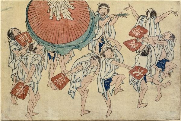 Curator: Right now, we are looking at a work by the renowned Japanese artist Katsushika Hokusai. It's a woodblock print titled "Street scenes newly published," created around 1825. You can find this gem housed in the Guimet Museum in Paris. Editor: Wow, it feels so immediate. Look at those guys wrestling with what looks like a giant lantern! There's a real energy to the scene. Is that paint they’re applying? I almost feel like I’m there, dodging the splashes! Curator: Indeed! Hokusai captured a bustling street scene, showcasing the everyday labor involved in creating a large lantern, perhaps for a festival or a commercial establishment. It's a genre painting within the Ukiyo-e tradition, depicting the "floating world" of common life and entertainment. Notice the detailed depiction of their clothing and tools. Editor: Ukiyo-e, huh? Makes sense. There's a real pop to it, though—more slapstick than profound. I mean, they’re painting a colossal… logo? It kind of looks like they're inventing a corporate identity! Is it me, or is there something wonderfully absurd about this? Curator: Well, remember this piece offers valuable insights into the visual culture of 19th-century Japan. The large lantern itself would likely be adorned with symbols and text meant to attract customers or celebrate a specific event, reflecting the socio-economic vitality of the period. These street scenes provided Hokusai a stage to display observation skills of people, which in my mind, defined much of the artist's life. Editor: I love how unpretentious it is. No emperors, no deities—just a bunch of guys battling a massive, unwieldy…thing. I bet it took a team to make just the blocks for a print with that many colors, let alone that lantern. Curator: Yes, the process of creating woodblock prints like this involved skilled artisans for carving the blocks and printing, each adding their expertise to Hokusai's original design. These images then circulated widely, shaping the visual landscape of the time. Editor: And now it's shaped ours! I look at this, and I don’t just see a historical document—I see a vibrant, breathing world caught mid-creation. It feels timeless. Curator: Exactly! Hokusai's ability to capture fleeting moments in a rapidly changing society is precisely what makes this woodblock print so enduringly captivating and worthy of our attention.