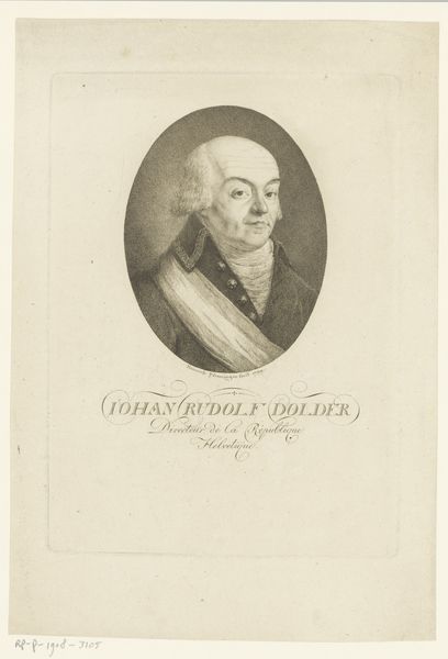 Editor: This is Henriëtte Félicité Tassaert’s 1788 engraving, "Portrait of Jean Pierre Antoine Tassaert." The muted tones give it a somewhat reserved feeling. I’m curious about the circular framing. What do you see in this piece? Curator: The composition, enclosed within that oval, immediately draws attention to the meticulous gradations of light and shadow across Tassaert’s face. Notice how the artist uses a sophisticated hatching technique to create a sense of depth and volume. The details in his clothing – those perfectly round buttons, for instance – serve to subtly offset the organic form of the portrait. Editor: So you're saying that contrast between the rigid and the fluid enhances the visual interest? Curator: Precisely. Consider how the engraver uses the restricted grayscale palette. Each tonal shift signifies a spatial shift, drawing the viewer into a world of three dimensions. Editor: It's interesting how the lack of color focuses our attention on texture and form. The line work seems particularly important here, and almost takes the place of color, defining everything from clothing, hair and the subtle nuances of skin. Curator: Indeed. And observe the subject's gaze. How does that specific engagement – that specific compositional engagement of subject – affect your understanding? Editor: Well, now that you mention it, I see how that sideways glance makes it more engaging, less of a standard portrait. It seems so... calculated! This formal approach actually draws me closer to examining the artistic approach rather than any personal or biographical interpretation. Thanks for pointing that out! Curator: A painting's true value comes not from outside information, but the interior framework established by artistic skill. And, for my part, it's been rewarding seeing the artistic framework taking root through your own insights.