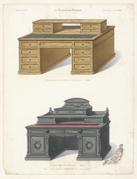Editor: So, here we have “Twee bureaus,” two desks rendered in drawing and print medium sometime after 1878. The ornamentation and wood-grain rendering are incredibly compelling. It’s as though someone has bottled up the gravitas of industry! What are your thoughts on it? Curator: Ah, yes. It makes me think of old libraries, doesn’t it? The smell of polished wood and leather-bound books. Look closely. What do you think is the artist trying to convey by juxtaposing these two desks with such contrasting detailing? Editor: One is ornate, all carvings and embellishments, while the other seems quite reserved with a classical formality. Is the artist possibly presenting different ideals, perhaps regarding status or wealth? Curator: Possibly. And, perhaps, about accessibility to culture as well? I almost feel I could pull up a chair to the plainer desk – whereas the other feels more forbidding, almost like a throne! Consider the context - "Le Magasin de Meubles" as the title suggests; is this more about salesmanship, about variety? The fine lines are wonderful either way! Which pulls you in more, visually? Editor: Definitely the first one; all those drawers offer promise! I hadn't thought about sales and marketing. I suppose this wasn't necessarily a piece of 'high' art? Curator: Perhaps that’s the beauty of it; it’s art embedded in commerce, something deeply human, deeply accessible. We sometimes separate “art” from daily life. The past often refuses to neatly categorize itself that way. I'd give both desks a place of honour; they speak different visual languages, each eloquent, yet somehow connected through the hand that drafted their being. Editor: It’s amazing how much you can unpack from a couple of desks! I'll never look at furniture catalogues the same way again!