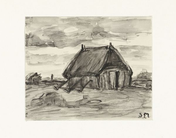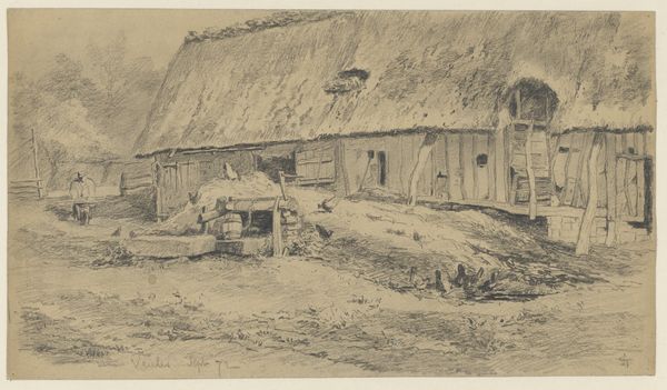 Editor: Here we have "Dorpspad met molen," or "Village Road with Mill," by Theo Nieuwenhuis, made sometime between 1876 and 1951. It's a pen and ink drawing currently held at the Rijksmuseum. The sketch-like quality makes me wonder about its purpose. What can you tell me about this piece? Curator: I see a direct representation of labor and production. The mill, rendered with precise hatching, highlights the industry of rural life. The artist employs the simple materials of pen and ink, a conscious choice reflecting perhaps the accessibility and democratization of art production at the time. Note how the drawing doesn't attempt to romanticize rural life; it's a functional scene. Editor: So, you see the materials and subject as intertwined with the means of production. The pen and ink suggests widespread availability, and the mill represents industry. Is that a challenge to traditional high art, given its mundane subject? Curator: Exactly. This detailed rendering of a mill and village path, with the very visible mark-making, refuses to conceal the labor involved. It draws our attention to the working class through this landscape. Consider the context: were industrial landscapes and genre paintings of this type meant for consumption by a specific social class? What does that tell us? Editor: That makes me think about who could afford art materials and who the patrons were... This wasn’t necessarily art for the elite, but perhaps for a rising middle class. I hadn't considered the social implications of the artist's material choices. Curator: Precisely. And what does this tell us about Nieuwenhuis' social or political leanings through the choices of his artistry and composition? These types of choices often hold significance, telling a story beyond the immediate picture plane.