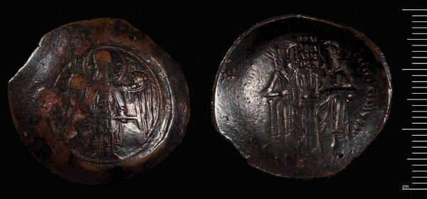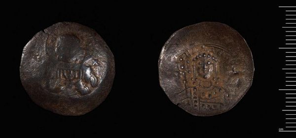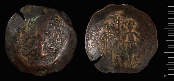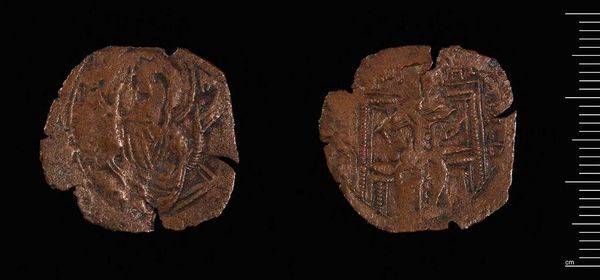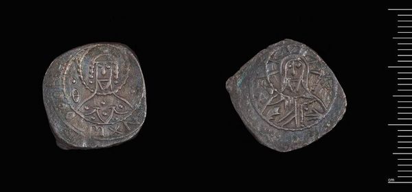 Curator: This is a "Trachy Type B of Michael VIII Doukas of Nikaia, Magnesia," a coin created by Michael VIII Doukas. Editor: It looks like two weathered faces gazing back at you from a bygone era, heavy with history and a touch of melancholy. Curator: Crafted during the reign of Michael VIII, this humble object offers insights into the economic and political landscape of the time. The production, I imagine, was quite standardized. Editor: Standardized, perhaps, but isn't there a primal allure in its very imperfection? The crude details, the worn edges... It echoes humanity’s grasp at power and permanence. Curator: Indeed, the wear speaks to the coin’s journey, its material life extending far beyond its initial minting. Editor: And to think, this little disc once passed from hand to hand, a silent witness to countless transactions, whispered secrets, maybe even a revolution or two. Makes you wonder, doesn’t it? Curator: Absolutely, and understanding its materiality deepens our appreciation. Editor: It certainly gives you a lot to think about.