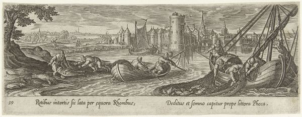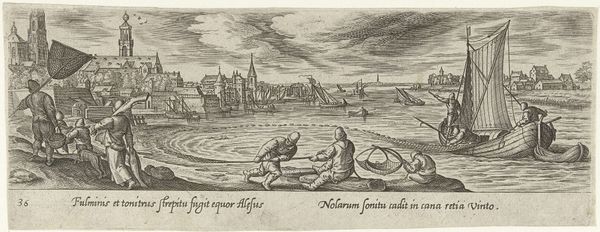 "Visvangst met fuiken," or "Fishing with Fykes," was created by Philips Galle, sometime between the 16th and 17th centuries using engraving techniques. Galle lived during a time of significant economic and social change in the Netherlands, as it was a period of burgeoning trade and maritime activities. This engraving depicts fishermen hauling in their catch with fykes, a type of net. Consider the labor involved, and the contrast between the active figures of the fishermen and the grand city in the background. What does it say about the relationship between labor and capital, or the tension between the rural and urban? It offers us a glimpse into the lives of working-class people who were crucial to the economy, yet often absent from the historical record. What can images like this tell us about the labor, class, and environmental changes of the time? While seemingly a simple scene, the print invites us to reflect on broader societal structures and lived experiences.