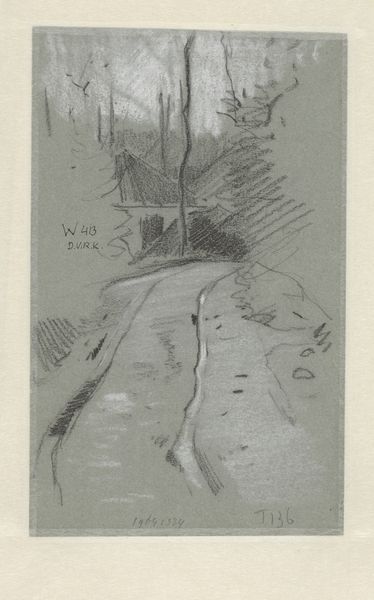 Editor: This is Henri de Toulouse-Lautrec’s 1895 poster, "Affiche voor het boek Le Tocsin in de krant La Dépêche de Toulouse," currently housed in the Rijksmuseum. It is a drawing done in ink and print, serving as a poster for a newspaper advertisement. The overwhelming palette creates an atmosphere of somber reflection. What stylistic choices draw your attention? Curator: Certainly. Focusing on its formal qualities, note how Lautrec uses line, or the suggestion thereof, to structure the composition. The trees serve as vertical pillars, contrasted by the curvilinear figure. Consider how the flatness of the image emphasizes the medium; this is, above all, a design meant for reproduction. Notice how tonal gradation is eschewed for blocks of color; it is this bold choice that helps to make the image 'pop' from a distance, doesn't it? Editor: Yes, that is quite perceptive. I'd not thought about the intent that informs its visibility, or "graphic" properties. How do you think its structure guides our reading of its intended purpose? Curator: The division of space is telling. The figure and the hound are set lower and dominate the space. Their positioning suggests not just a stroll but, due to the addition of "Le Tocsin," a feeling of alert. Above is 'La Depeche'. Would you consider the division as an intentional message? Editor: Definitely, especially given its nature as a print; one could extrapolate that this work emphasizes advertising as not only informational but aesthetically oriented. A formal articulation, mirroring its function. I appreciate your perspective! Curator: And I yours. Observing the construction enhances an understanding of not only its visual appeal, but also its practical utility.