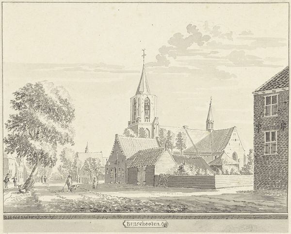 Jan de Beijer made this drawing of a church in Aalst with pen and brown ink, and grey wash. The artist's hand is evident in the cross-hatching that defines the church's walls and roof. The ink lines vary in thickness, giving the image depth and texture, while the grey wash adds shadows and atmospheric perspective, making it feel like the church is set within its location. De Beijer, active in the 18th century, belonged to a tradition of topographical artists, who meticulously documented landscapes and buildings. This was a time before photography, when accurate depictions relied on skilled draftsmanship. The level of detail suggests a commitment to truthfully rendering what he saw, and the application of the wash indicates attention to light and shadow. The work involved in creating this image speaks to a culture that valued skilled craftsmanship. It sits at the intersection of art, documentation, and social history.