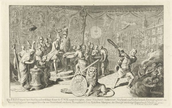 Curator: This engraving, housed here at the Rijksmuseum, presents a dramatic tableau from history. Entitled "Alexander the Great with the family of Darius," it was created between 1666 and 1707 by Gerard Edelinck. Editor: My initial reaction is a sense of controlled chaos. The composition feels almost stage-like, with a clear foreground and background, yet the multitude of figures creates a visual density that is both compelling and a bit overwhelming. Curator: Indeed, the scene is carefully staged, mirroring theatrical conventions of the period. We see Alexander meeting Darius's family, offering them safety and respect after his victory. The image taps into Alexander's reputation for magnanimity. Notice the contrast: the stoic warrior against the emotional outpouring of the defeated family. This motif underscores the power of mercy versus might. Editor: Formally, the artist uses light and shadow masterfully to guide the eye. The contrast emphasizes the drama and helps to distinguish key figures within the throng. It's all about contrasting textures, from the intricate armor to the soft drapery. The linear perspective leads the eye to Alexander's troops on the horizon and provides a tangible backdrop. Curator: The image leans heavily into the symbol of gesture. The Queen Mother kneels, her hands outstretched, embodying submission, gratitude, perhaps even supplication. This is juxtaposed with Alexander’s firm stance and extended arm that denotes control and assurance. He’s offering not just protection, but also a promise of a new order, one guided by different rules of conduct and conflict. Editor: I find myself pondering the somewhat flat treatment of the faces, they’re generic in a way, as though embodying archetypes, rather than capturing individual personalities. This allows Edelinck to focus our attention on the overall dynamic. It's fascinating how the absence of intense individual expression reinforces the power of the collective emotional response. Curator: The engraving is definitely embedded in its cultural context. The story of Alexander serves as an allegory for leadership. The image is a call for rulers to practice restraint in victory, thus etching themselves into a heroic legacy. Editor: Looking at it closely one last time, the level of detail and overall impression suggests not only meticulous skill, but also thoughtful manipulation of emotional response through form. Curator: Ultimately, it’s a carefully crafted depiction of a ruler, but, on a wider scope, a timeless narrative of compassion during war.