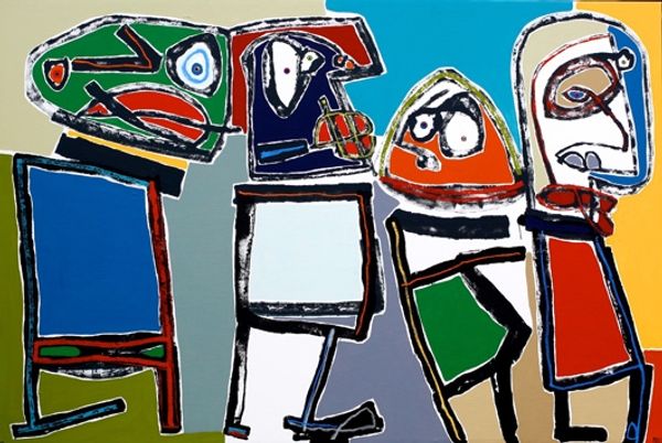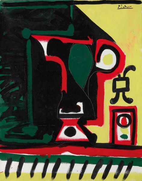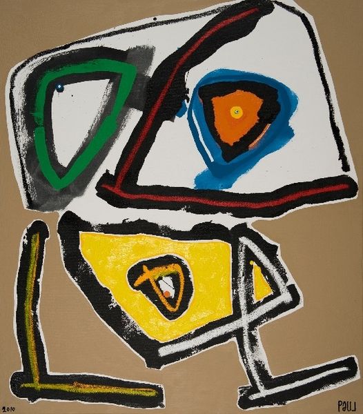 Editor: This untitled acrylic painting by Paul du Toit, dated 2010, strikes me as playful but also a little chaotic, with its bold colors and seemingly random geometric shapes. How would you interpret this piece? Curator: It's fascinating how du Toit synthesizes street art and modernism, isn't it? Given his history, growing up under apartheid and its influence in the art world, this vibrant, almost cartoonish style could be viewed as a deliberate rebellion against the restrictions and socio-political turmoil that defined his early life. Do you notice the almost mask-like quality of the central image? Editor: Yes, it does feel like a deconstructed face. The bright colours and thick black outlines also give it a kind of pop art vibe. Do you think it's making a particular comment about South African identity? Curator: Perhaps, yes, considering the use of caricature. These kinds of simplified representations are never neutral, and it makes me think of how identities were, and sometimes still are, simplified or even weaponized for political purposes. Pop art's adoption can then been seen as a direct response to and critic of those simplifications by popular culture and the media. How effective do you find his approach? Editor: That’s a really interesting point! I hadn't considered the political implications of caricature in this context. I appreciate how you connected du Toit’s personal history and the political background. Curator: And I am reminded how critical engagement with public art encourages conversations about sensitive issues by challenging pre-conceived notions of beauty and appropriateness. It's a powerful reminder that art is always political.